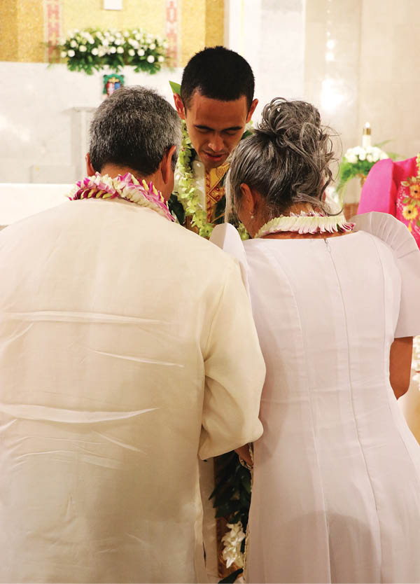 New priest Father Rosales-Llantos gives a first blessing to his parents, Errol and Lovette Llantos, after his ordination Mass. (HCH Photo | Anna Weaver )