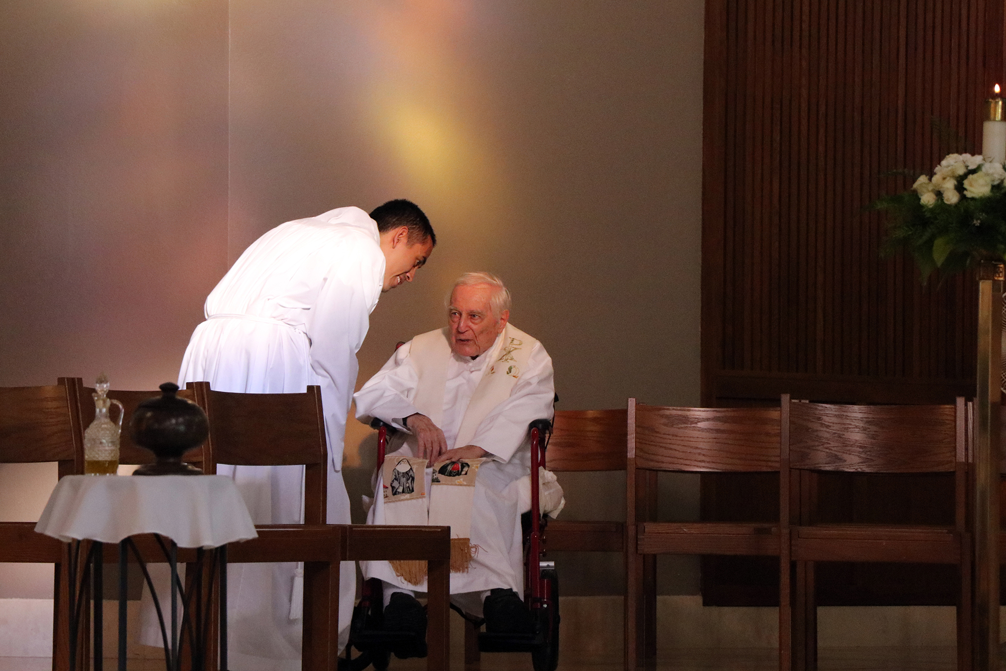 Arrion Rosales-Llantos speaks with retired diocesan priest Father Clarence “Larry” Fisher before Mass on May 19. (HCH Photo | Anna Weaver)