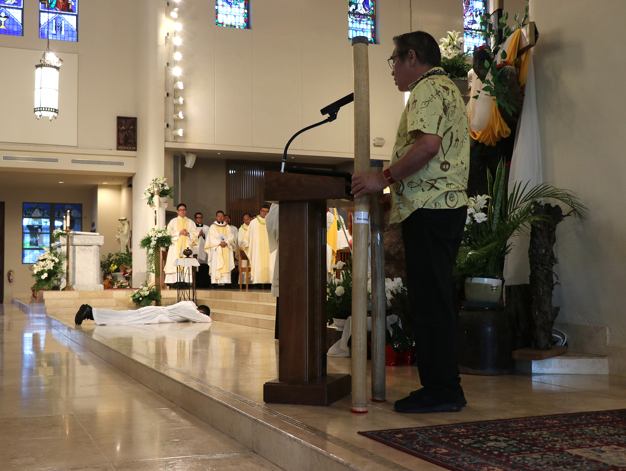 The repetitive sound of kā’eke’eke nui (bamboo drums) brought over from the Wailau Valley on Molokai also added a striking addition to the Litany of Supplication, where the congregation asks God’s blessing on the priest candidate, who lies prone on the altar floor.