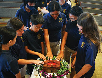 The next day at 8:15 a.m., St. Anthony Church and School gathered for Mass. St. Anthony School students led the liturgy with singing, reading, cantoring and serving. More than 400 people attended the Mass, including St. Anthony parishioners, some of the parents of the students, and Catholics from around Maui.