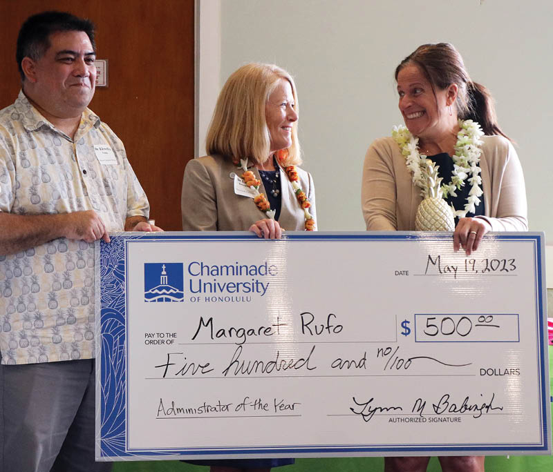 Above, in an announcement that took her by surprise, Margaret Rufo, the principal of Mary, Star of the Sea School in Waialae-Kahala, is the first winner of the Golden Pineapple Administrator of the Year award and receives $500 from the same donors. On the left in both photos is the superintendent of Hawaii Catholic schools Llewellyn Young. In the center is Lynn Babington president of Chaminade University of Honolulu.