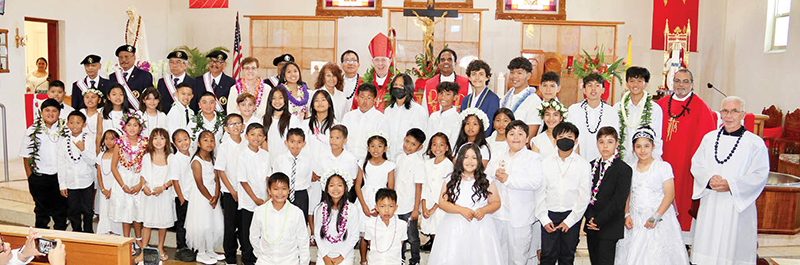 Bishop Larry Silva confirmed 44 students, including an adult of 75 years, who also received their first holy Communion May 27 at Christ the King Church, Kahului. (Photo courtesy of Audie Pascual)