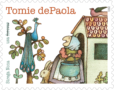 The U.S. Postal Service just released a stamp that bursts with nostalgia: an homage to the beloved author and illustrator Tomie dePaola. It depicts his best-known character, Strega Nona, who earned him a Caldecott Medal in 1976, clutching her pasta pot and smiling at her peacock.