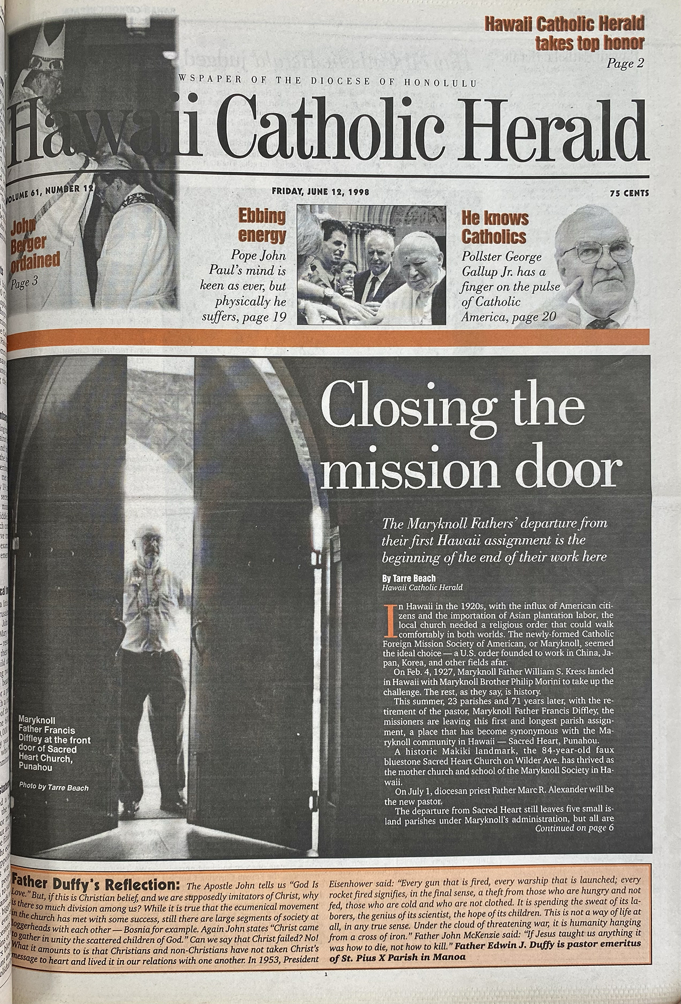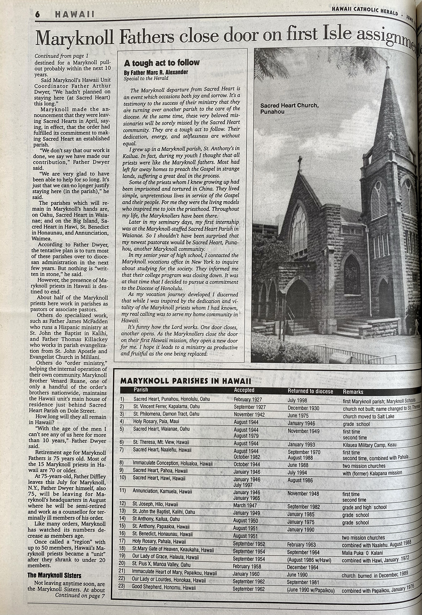 This summer, 23 parishes and 71 years later, with the retirement of the pastor, Maryknoll Father Francis Diffley, the missioners are leaving this first and longest parish assignment, a place that has become synonymous with the Maryknoll community in Hawaii — Sacred Heart, Punahou.