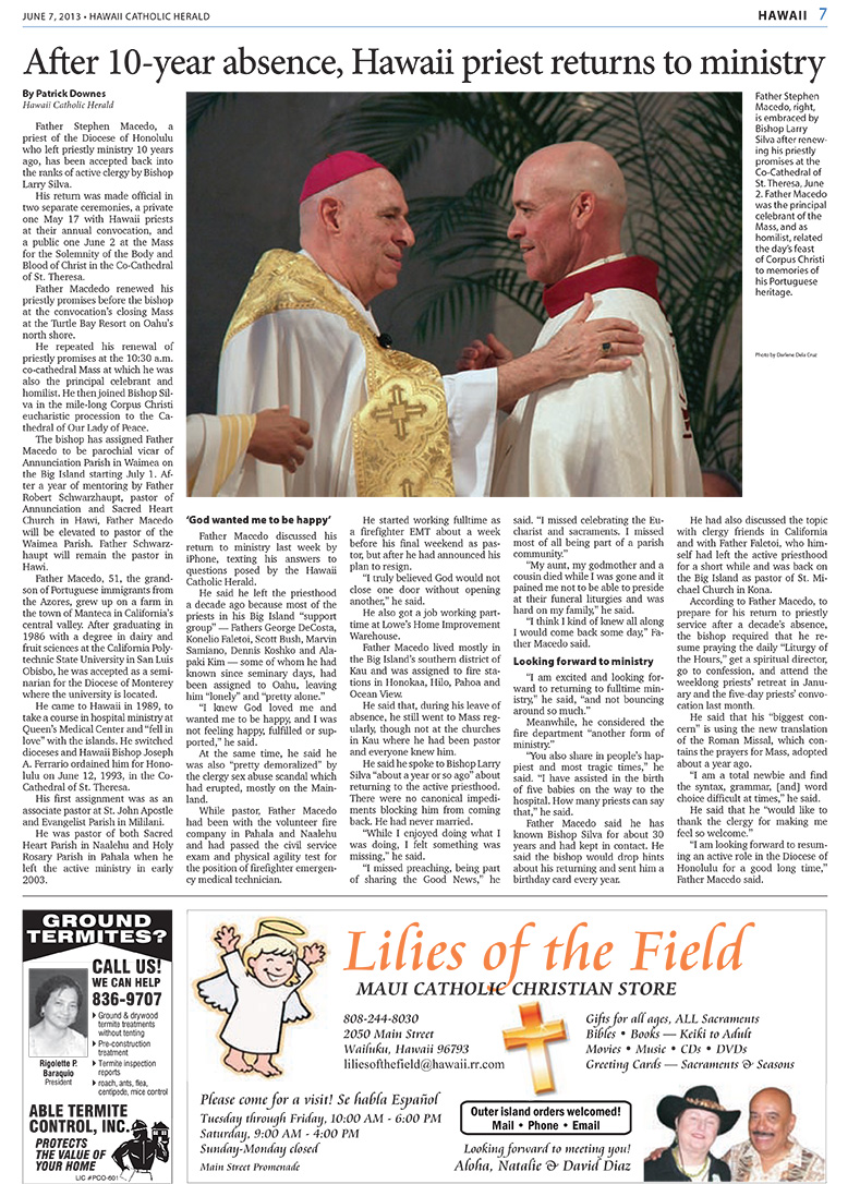 Father Stephen Macedo, a priest of the Diocese of Honolulu who left priestly ministry 10 years ago, has been accepted back into the ranks of active clergy by Bishop Larry Silva.