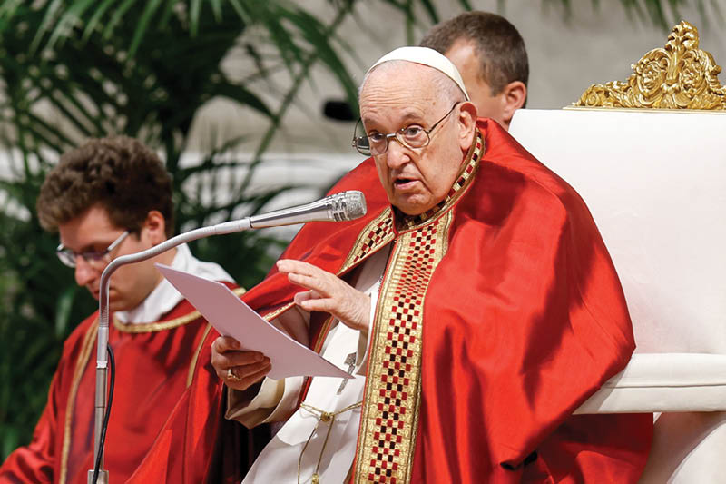 Pope Francis delivers his homily during his Pentecost Mass in St. Peter’s Basilica at the Vatican May 28, 2023. Pope Francis called on Catholics to invoke daily the Spirit who gives “harmony to the world.” (CNS photo/Lola Gomez)
