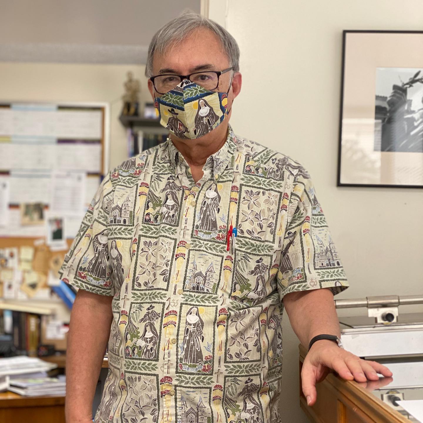 Hawaii Catholic Herald editor Patrick Downes wears one of Wendy Wylder’s Sts. Damien and Marianne masks in 2020. (HCH Photo)
