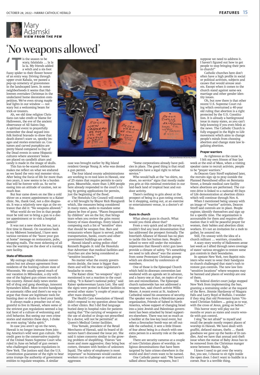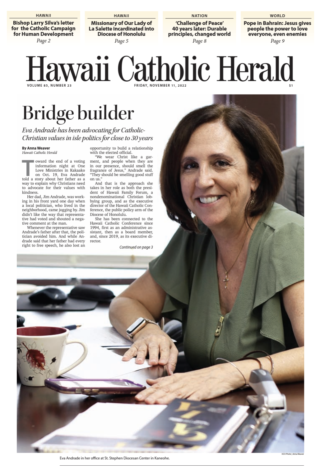 The Herald took second place for “Best Coverage – Political Issues” for three submissions, two columns written by “View from the pew” columnist Mary Adamski, “No weapons allowed,” and “Season of elections,” and Weaver’s profile of Eva Andrade, director of the Hawaii Catholic Conference, “Advocating for Catholic values.”