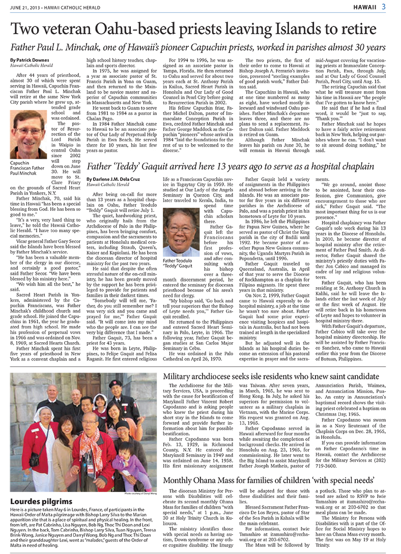 The Archdiocese for the Military Services, USA, is proceeding with the cause for beatification of Maryknoll Father Vincent Robert Capodanno and is asking people who knew the priest during his short stay in the Islands to come forward and provide further information about him for possible beatification.