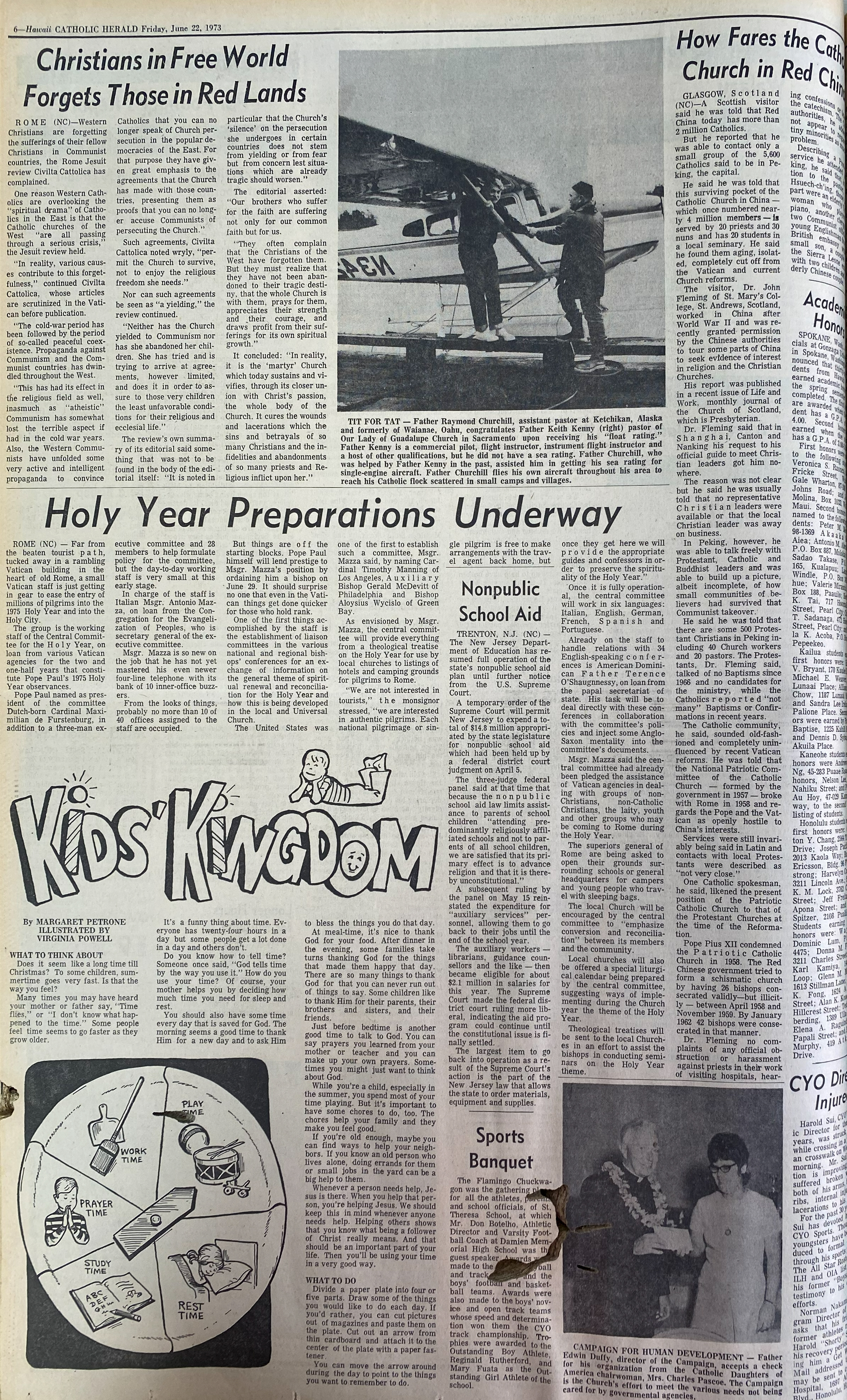 TIT FOR TAT – Father Raymond Churchill, assistant pastor at Ketchikan, Alaska, and formerly of Waianae, Oahu, congratulates Father Keith Kenny (left) pastor of Our Lady of Guadalupe Church in Sacramento upon receiving his “float rating.” Father Kenny is a commercial pilot, flight instructor, instrument flight instructor and a host of other qualifications, but he did not have a sea rating. Father Churchill, who was helped by Father Kenny in the past, assisted him in getting his sea rating for a single-engine aircraft. Father Churchill flies his own aircraft throughout his area to reach his Catholic flock scattered in small camps and villages.