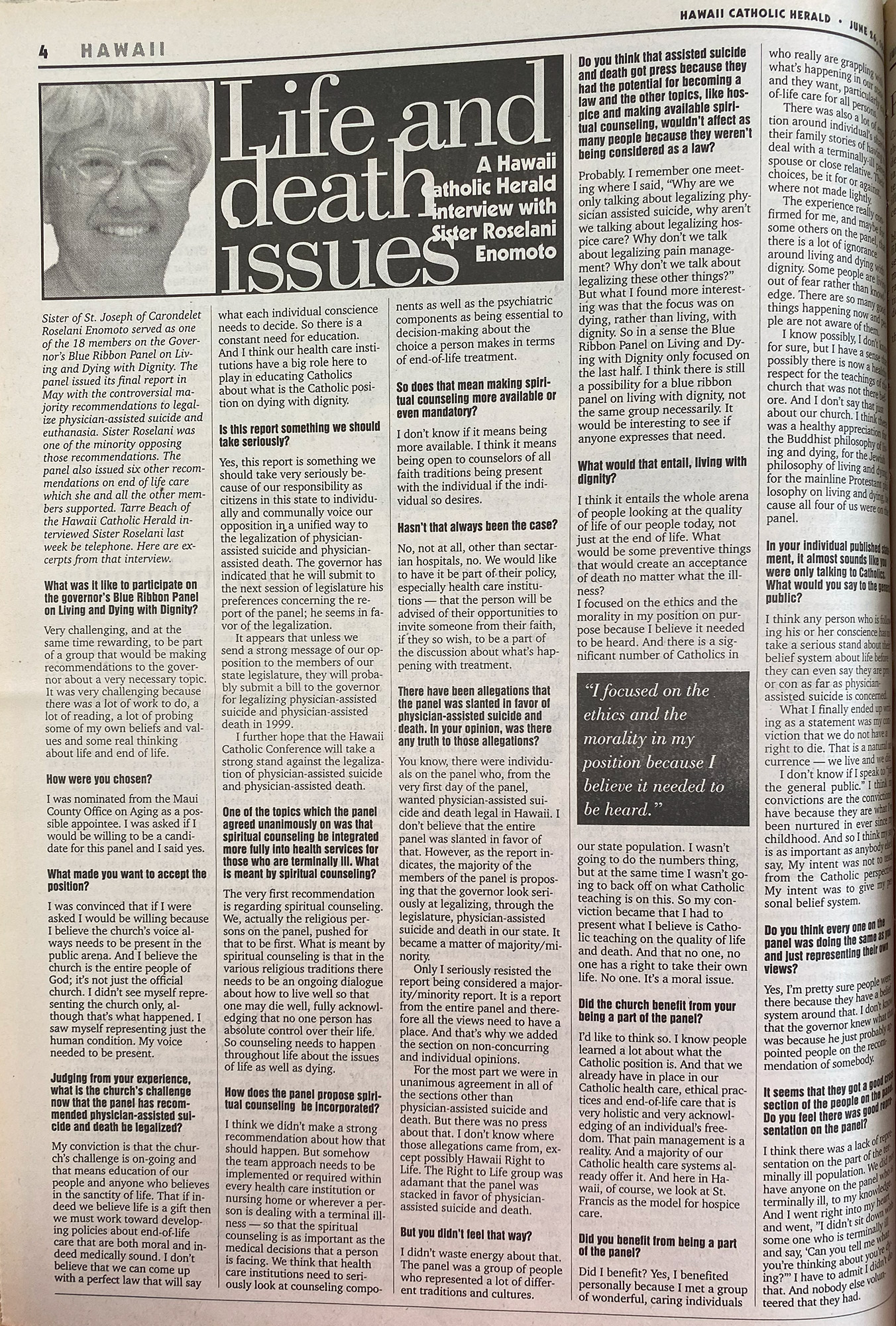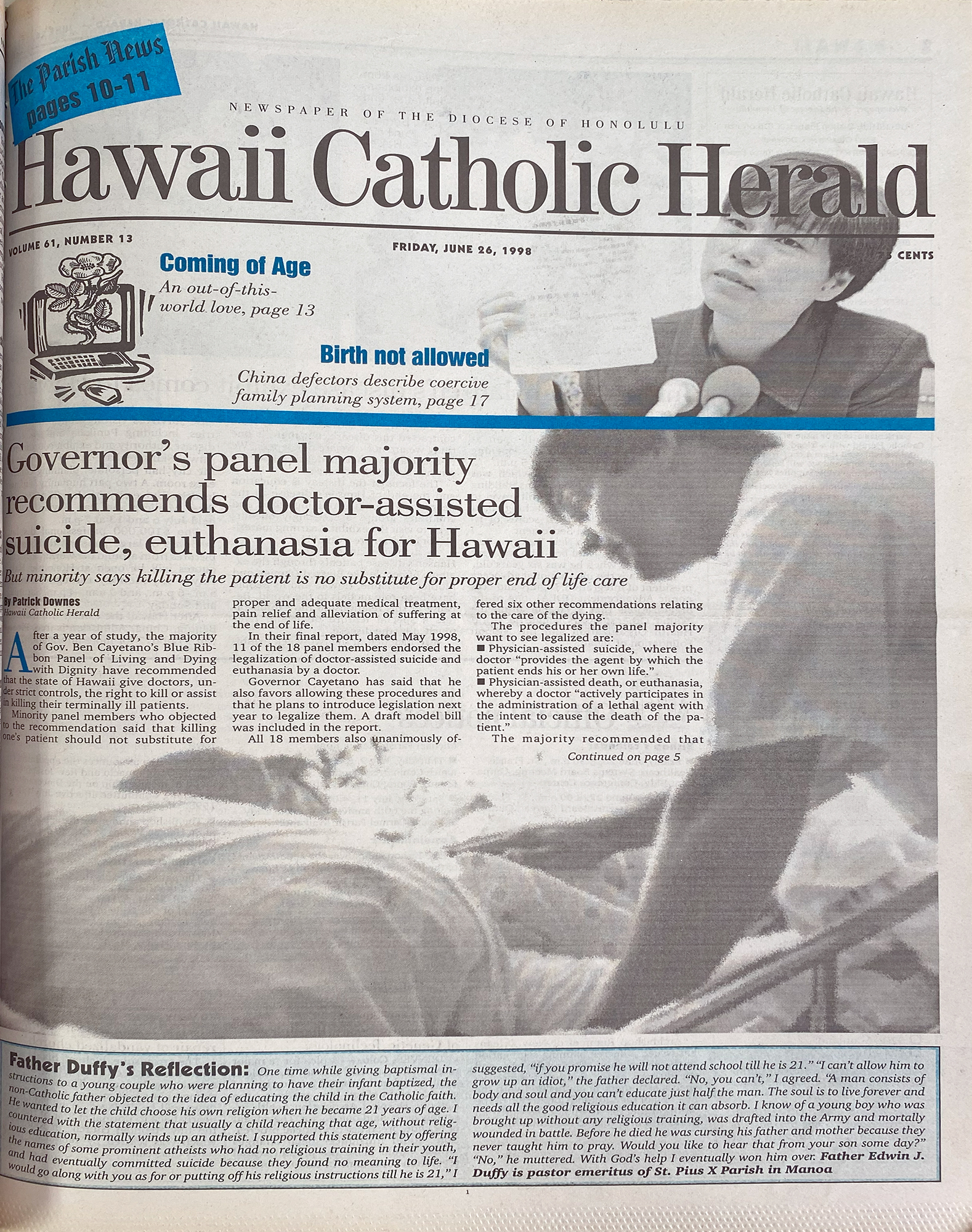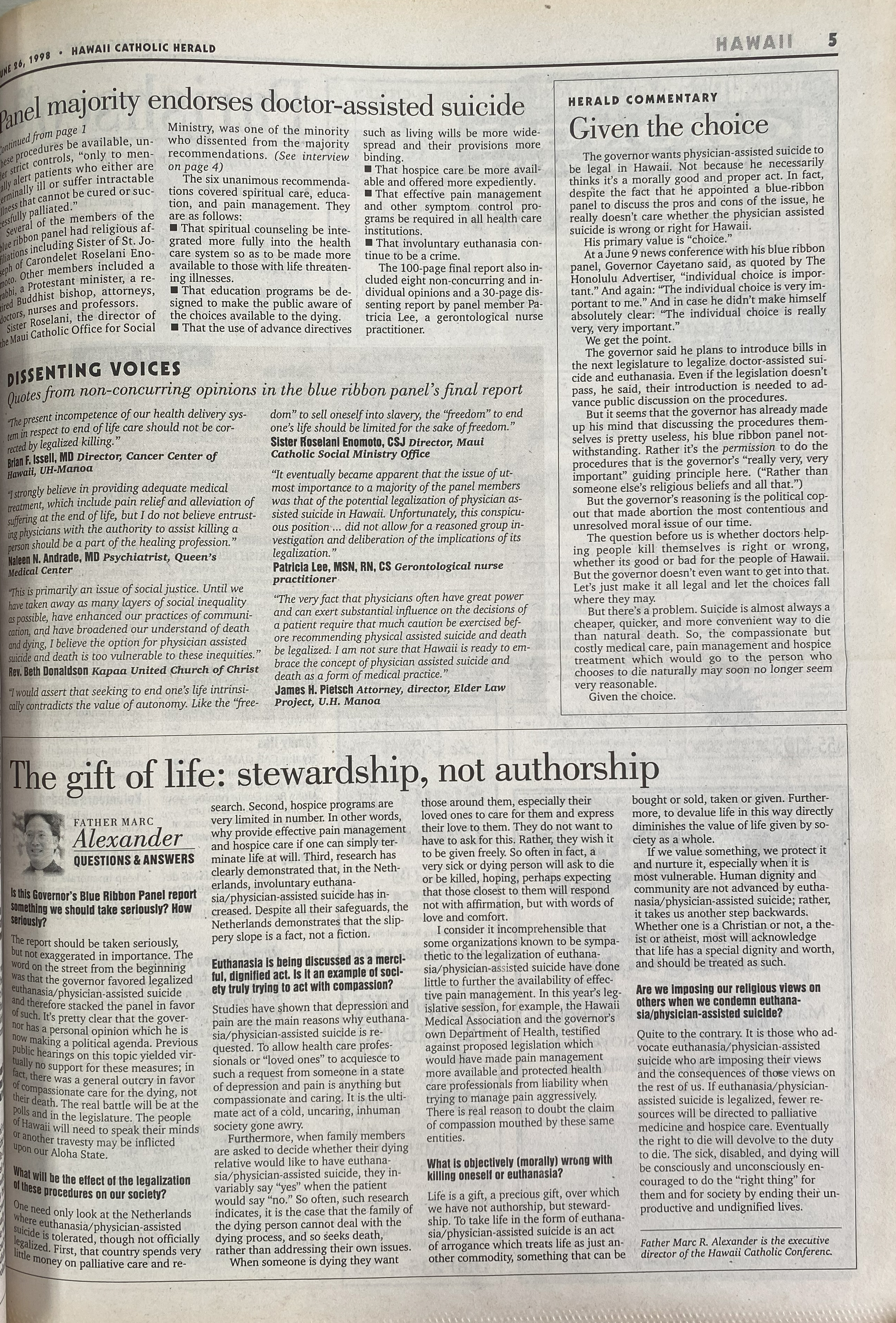After a year of study, the majority of Gov. Ben Cayetano’s Blue Ribbon Panel of Living and Dying with Dignity have recommended that the state of Hawaii give doctors, under strict controls, the right to kill or assist in killing their terminally ill patients.