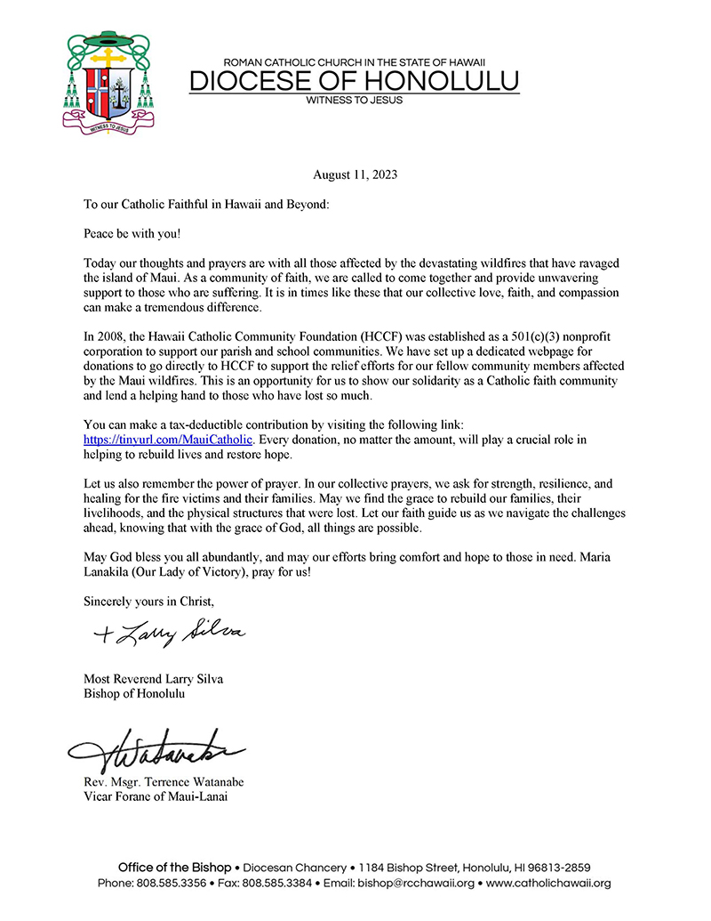 Letter from Bishop Silva on the Lahaina Wildfire 08/16/2023 by Hawaii Catholic Herald Click here to view pdf of Bishop Larry Silva’s Maui Wildfire Donation Letter
