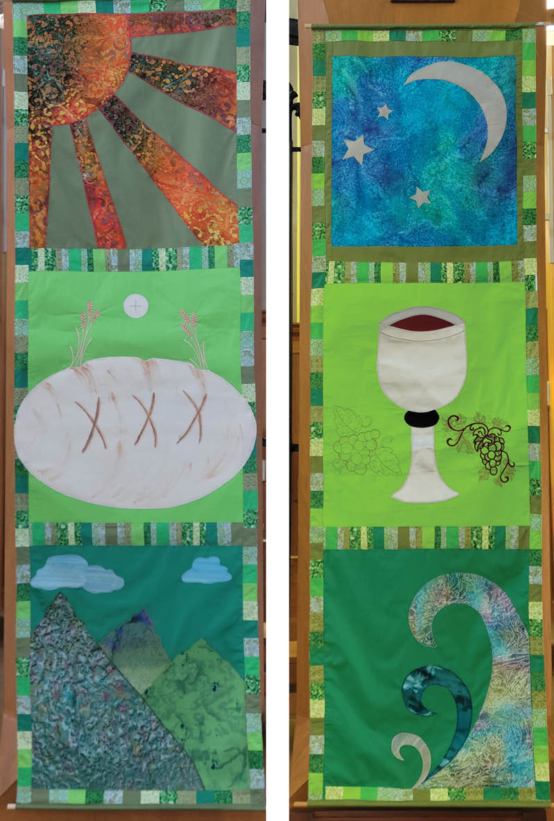 To illustrate this belief, a very talented parishioner crafted two banners that are hung on pillars behind the altar. The first banner celebrates the bread, a food that offers sustenance. This banner is divided into three sections. The top shows the sun as we start our day. The second, bread, a life sustaining food that Jesus shared. The third depicts the mountains.