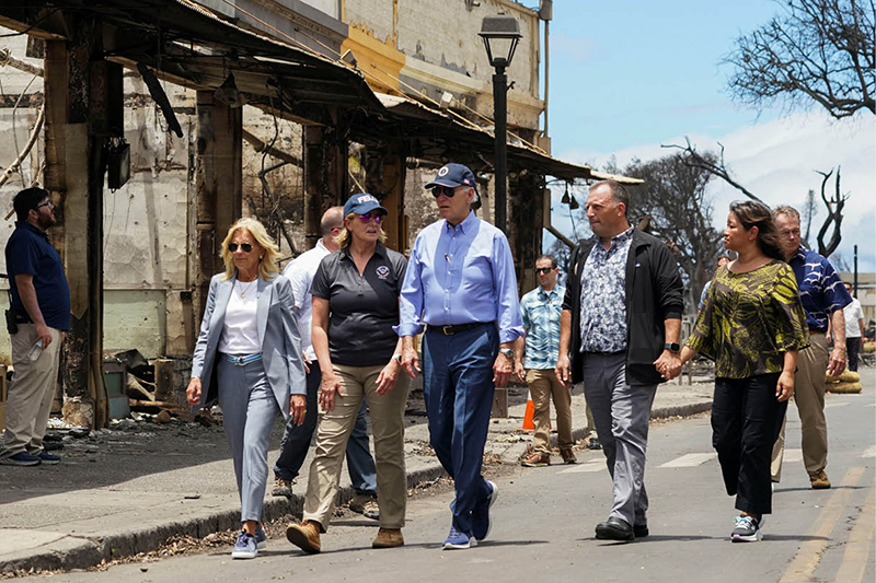 U.S. President Joe Biden and first lady Jill Biden, accompanied by Hawaii Gov. Josh Green, first lady Jaime Kanani Green and FEMA administrator Deanne Criswell, visit the fire-ravaged town of Lahaina on the Hawaiian island of Maui Aug. 21, 2023. Biden told survivors of Maui’s wildfires the nation “grieves with you.” (OSV News photo/Kevin Lamarque, Reuters)