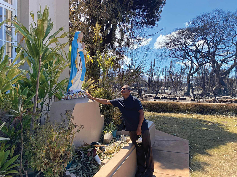 Missionaries of Faith Father Kuriakose Nadooparambil, pastor of Maria Lanakila Church in Lahaina, Maui, Aug. 16 touches a statue of the Blessed Virgin Mary which still stands amid foliage untouched by the wildfire that scorched trees across the street and destroyed the entire town of Lahaina. (Photo courtesy of Maria Lanakila Parish)