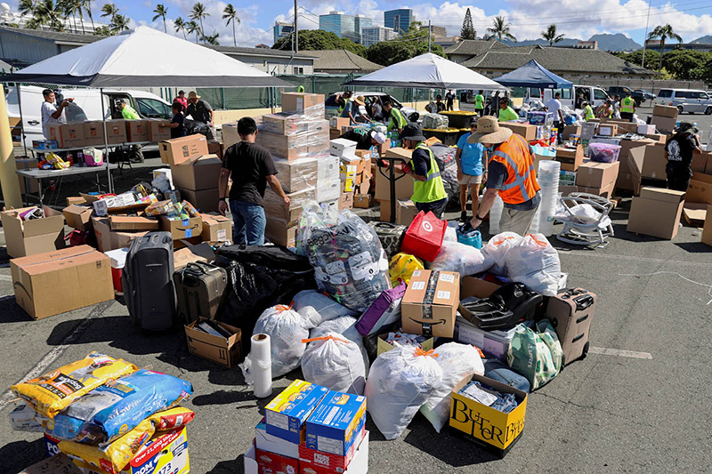 Volunteers prepare donations for the victims of the Maui wildfires at Pier 1 in Honolulu Aug. 12, 2023. (OSV News photo/Marco Garcia, Reuters)