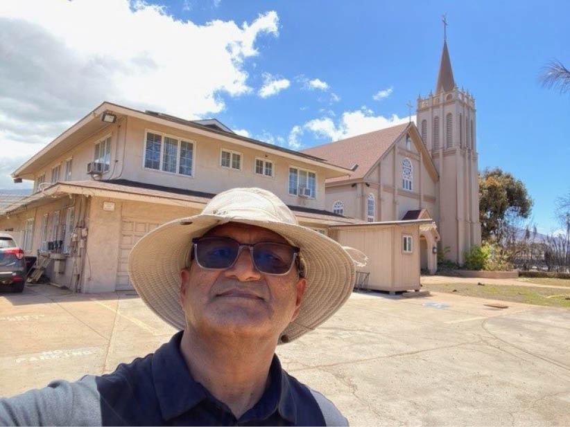 Missionaries of Faith Father Kuriakose Nadooparambil, pastor of Maria Lanakila Church in Lahaina, Maui, Aug. 16 takes a selfie outside the rectory and church which emerged untouched by the wildfire that destroyed the entire town of Lahaina. (Photo courtesy of Maria Lanakila Parish)