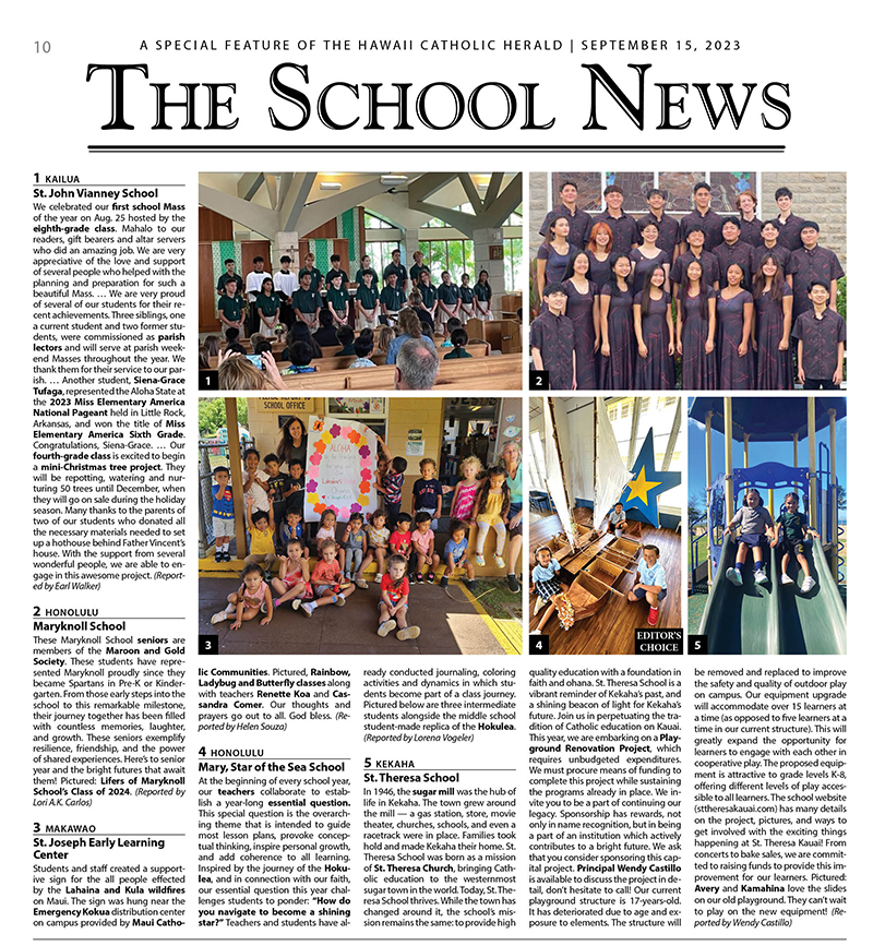 Hawaii Catholic Herald School News 09/13/2023 by Hawaii Catholic Herald Click here to view a pdf of the Sept. 15, 2023 School News.