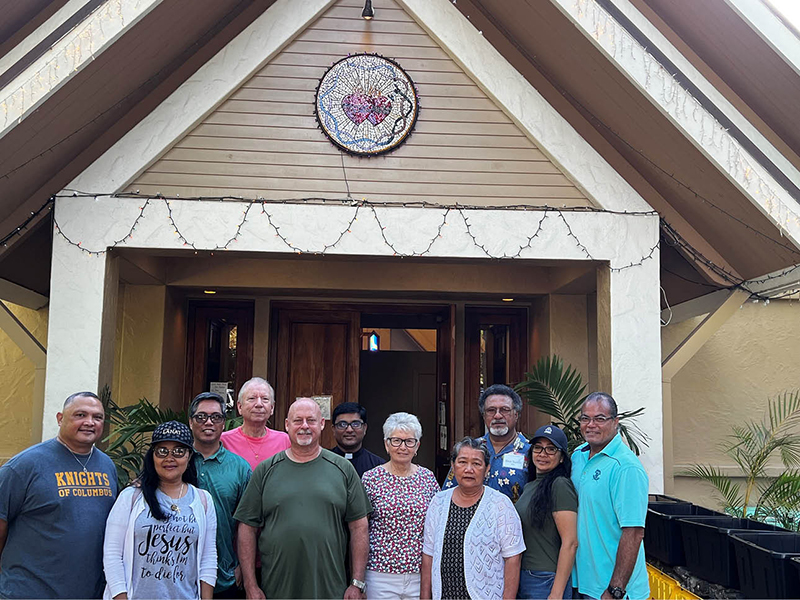 Mercy Mission participants and volunteers gather Sept. 1 at Sacred Hearts Mission in Kapalua. From left, Knight of Columbus Patrick Guzman, Divina Costales, Deacon Henry Costales, Joe Esser, Knight of Columbus Jared Zick, Father Raju Palleti, MF, Carmela Esser, Marietta del Castillo, Deacon Savili Bartley, Dawn Ribucan, Deacon Chris Ribucan. (Photo courtesy of Deacon Chris Ribucan)