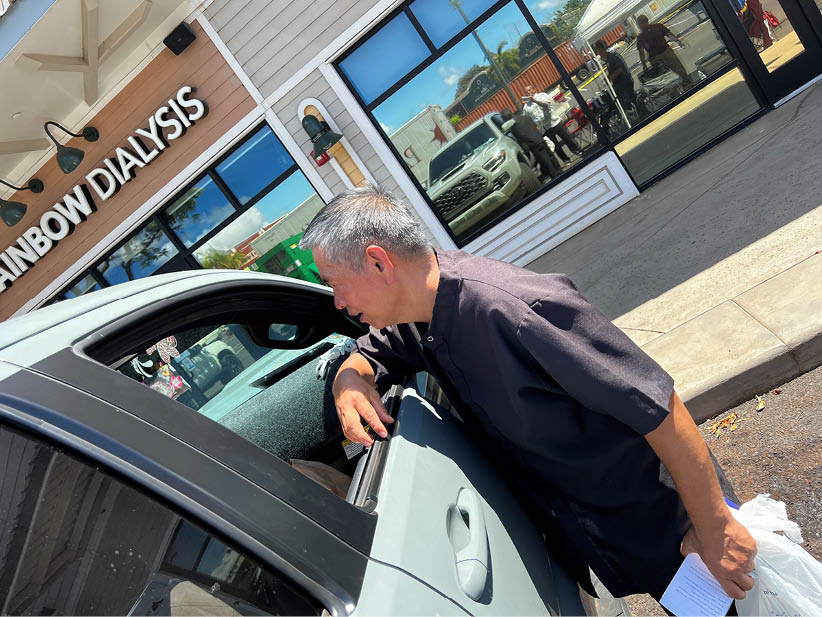Father Anselmo “Jun” Bobier, from Our Lady of Lourdes Parish in Honokaa, chats with someone in a truck near a temporary distribution center at Lahaina Gateway Shopping Center. (Photo courtesy of Deacon Chris Ribucan)