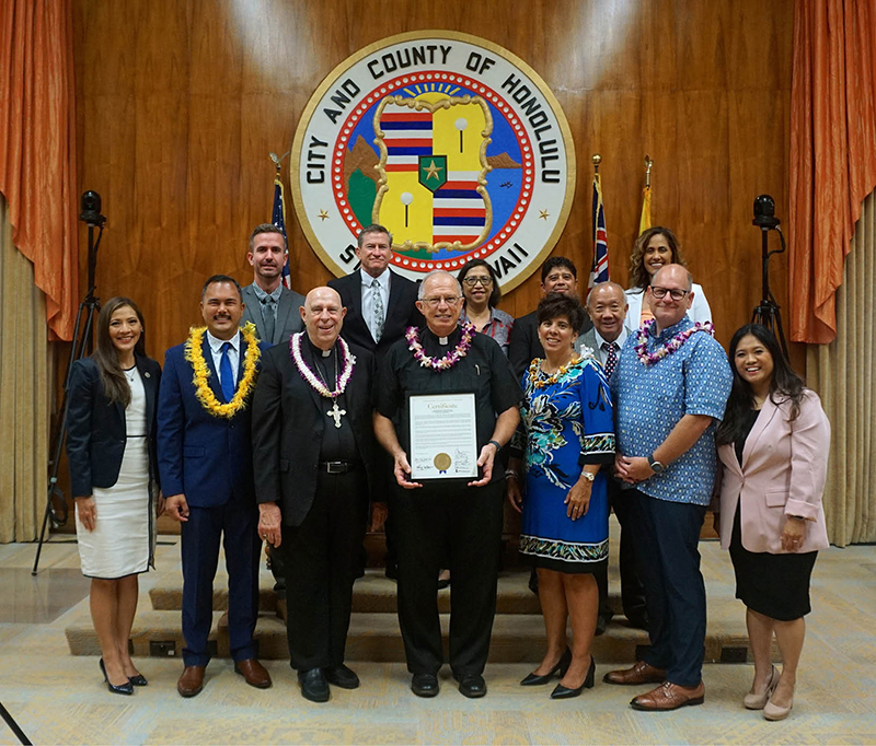 Diocesan vicar general Msgr. Gary Secor holds the framed resolution presented by the City and County of Honolulu Sept. 6 to Bishop Larry Silva, pictured to the left of Msgr. Secor, honoring the 180th Anniversary of the Dedication of the Cathedral Basilica of Our Lady of Peace in downtown Honolulu. Also attending the ceremony Councilman Tyler Dos Santos Tam who initiated the resolution; consultant Kekoa McClellan, who helped arrange for the resolution; Scott Ruppel, Cathedral Renewal Project Consultant, Katey Dallosto, Cathedral Renewal Fundraising Consultant, and other City Council members. In a mahalo letter to Councilman Dos Santos Tam, Bishop Silva wrote, “We are most appreciative of your kindness in honoring this sacred place!” He said that he hopes the resolution will help further the completion of the full renovation of the cathedral in a couple of years. (Photo courtesy of the Honolulu City Council)