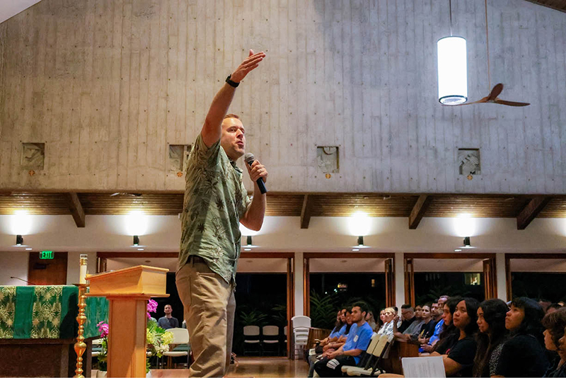 Chris Stefanick speaks to a crowd of 500 about God’s love Sept. 6 in St. John Apostle and Evangelist Church, Mililani. (HCH photo | Jennifer Rector)