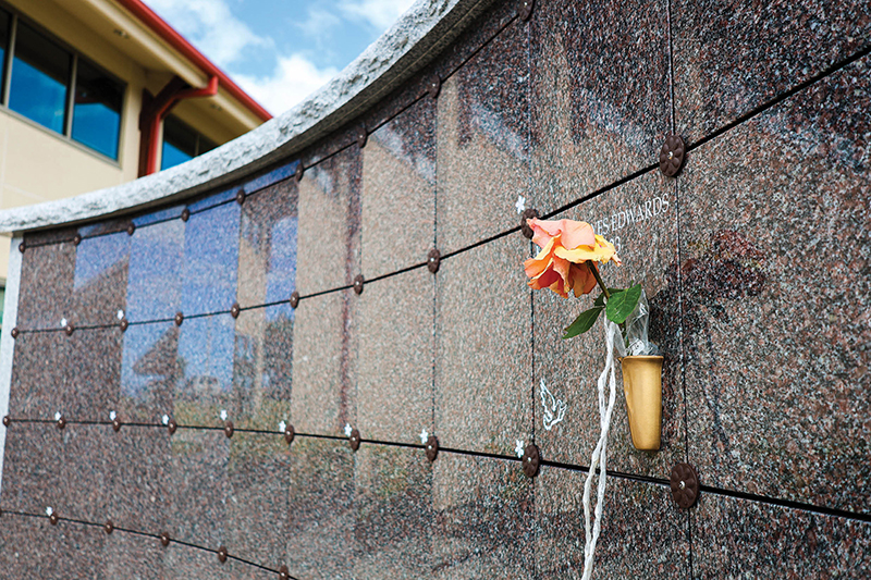 The columbarium at Resurrection of the Lord Church, Waipio, Oahu, has its first niche in use, marked by a flower. (HCH photo | Jennifer Rector)