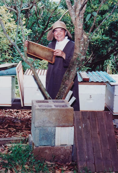 Carmelite Sister Teresita Tam tends the bee hives in an undated photo. (Courtesy photo)