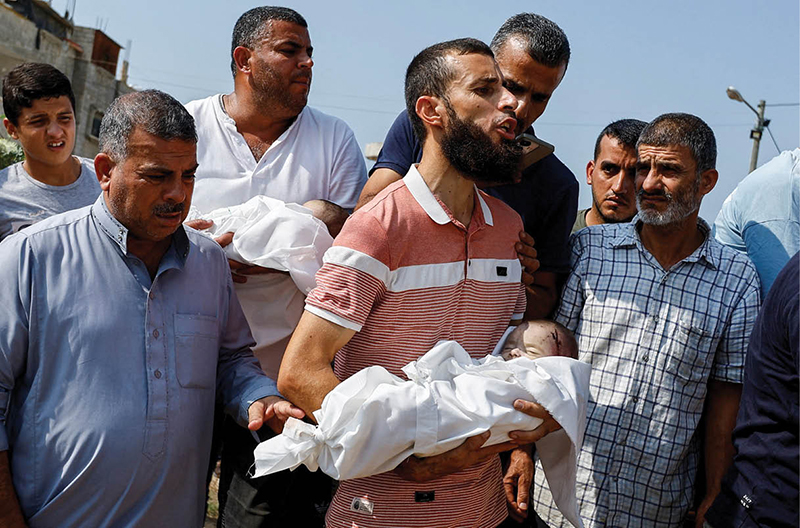 Mourners carry the bodies of twin Palestinian babies, Ossayd and Mohammad Abu Hmaid, during their funeral in Khan Younis in the southern Gaza Strip Oct. 8, 2023. Health officials said they were killed along with their mother and three sisters in Israeli strikes. (OSV News photo/Ibraheem Abu Mustafa, Reuters)