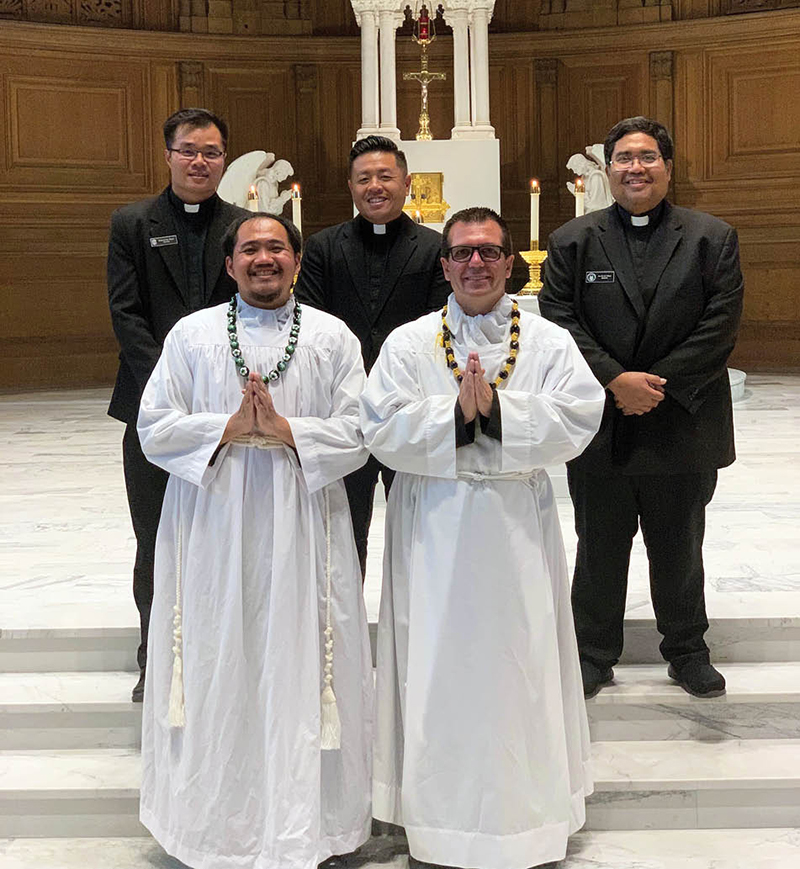 Seminarians Edgar Pobre, front left, in his first year of theology at St. Patrick’s Seminary and University, and Larry Denis III, in his third year, on Sept. 22 received their Candidacy to the Holy Orders, another step in their vocation journey. The rite was presided over by San Francisco Archbishop Salvatore Cordileone. Joining the picture are other Diocese of Honolulu seminarians, from left, Deacon Francis Hai Pham, Anthony Tran and Deacon Kurt Meyer. (Photo courtesy of Larry Denis)