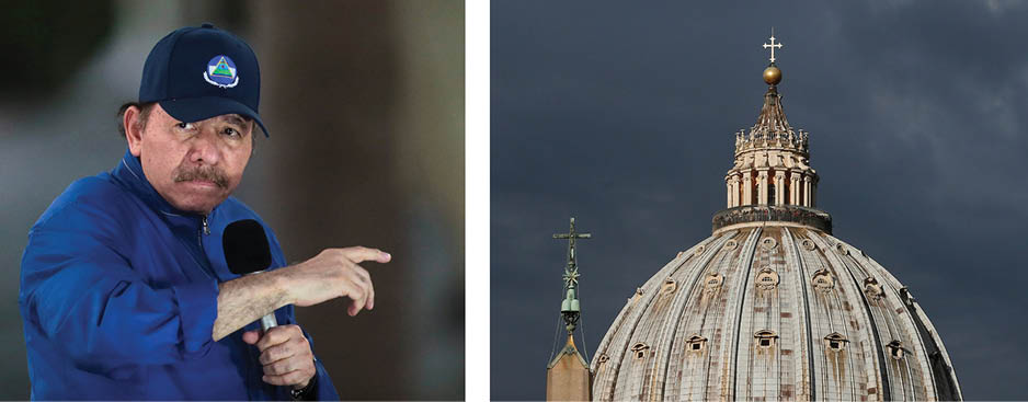 Nicaraguan President Daniel Ortega and the dome of the Vatican’s St. Peter’s Basilica are pictured in a combination photo. Twelve detained Nicaraguan priests were sent to Rome late Oct. 18, 2023, after an agreement with the Vatican, the Nicaraguan regime said. (OSV News photo/Oswaldo Rivas, Reuters/CNS file, Paul Haring)