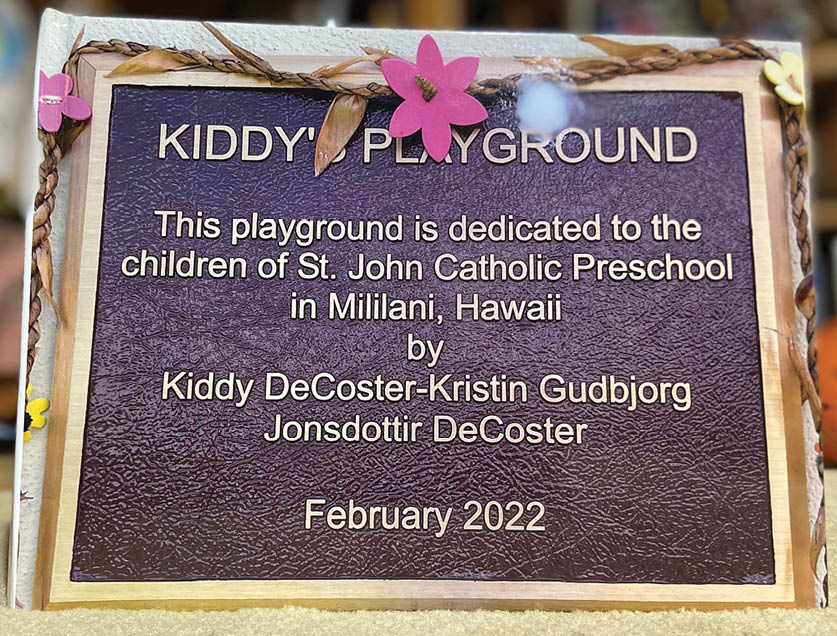 Daniel J. Del Monte Jr. is a 30-year parishioner of St. John Apostle and Evangelist Church in Mililani who is so grateful for the friendship of the late Richard and Kristin “Kiddy” DeCoster, also of St. John, that he built Kiddy’s Playground for the parish preschool, established a Kiddy scholarship fund for the school and published a 72-page full-color glossy large format photo book in honor of Kiddy (inset), whose generosity and voluntarism knew no bounds. Pictured above is the cover of the book which has a photo of the playground dedication plaque. DeCoster gave her time, energy, handicrafts and money to cancer patients, military families, her parish and many other causes. Kiddy died in 2021, but if you want to continue her giving spirit, go the HawaiiCommunityFoundation.org, click on “Give” and select “Kiddy’s Fund.” Or send a check to Hawaii Community Foundation, 827 Fort Street Mall, Honolulu, HI 96813. If you would like your own copy of “Kiddy’s book,” email Del Monte at ddelmonte@hawaii.rr.com. It costs $52.25 plus postage. (HCH photo)