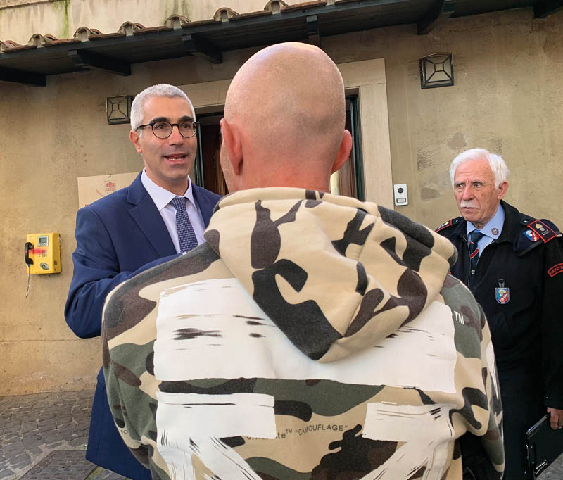 Dr. Massimo Ralli, director of the Vatican’s “Madre di Misericordia” (Mother of Mercy) Clinic, speaks to a man seeking assistance outside the free clinic near the colonnade surrounding St. Peter’s Square in the Vatican Nov. 13. (CNS photo/Cindy Wooden)