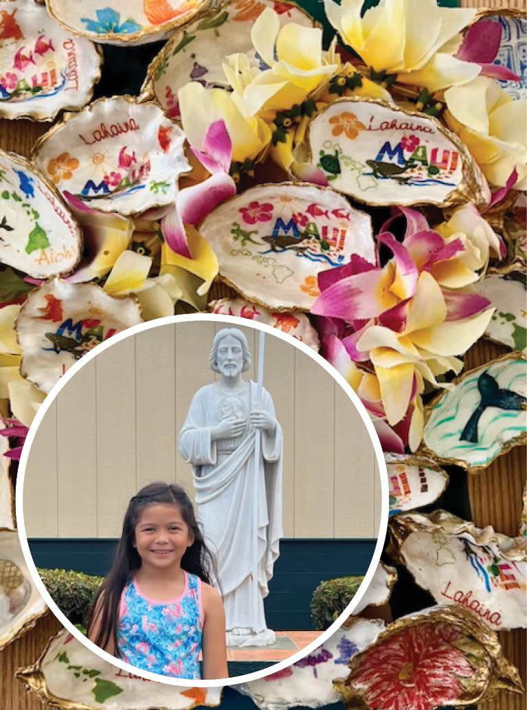Meet Zaya Moylan Ayson, one of the newest students of the children’s sacramental preparation class at St. Jude Parish, Kapolei. The parish religious education program is so very proud of 8-year-old Zaya, who raised $500 for the Maui Wildfire Victims by selling these Maui-themed hand-decorated seashells (background). Moved by her selfless gesture, the parish wishes to acknowledge the gallant intentions of this promising child who has embarked on her stewardship crusade early on, showing compassion and generosity at a remarkably young age. May others be inspired by her example! (Photo courtesy of Tere Hunt)