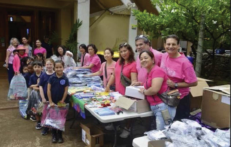 Dr. Amelia Valdez (in the white blouse) of San Francisco, the founder of the Valdez Charitable Foundation, overlooks the distribution of donations for Lahaina’s Sacred Hearts School, temporarily located in Kapalua. (Photo courtesy of Ether Tokars)