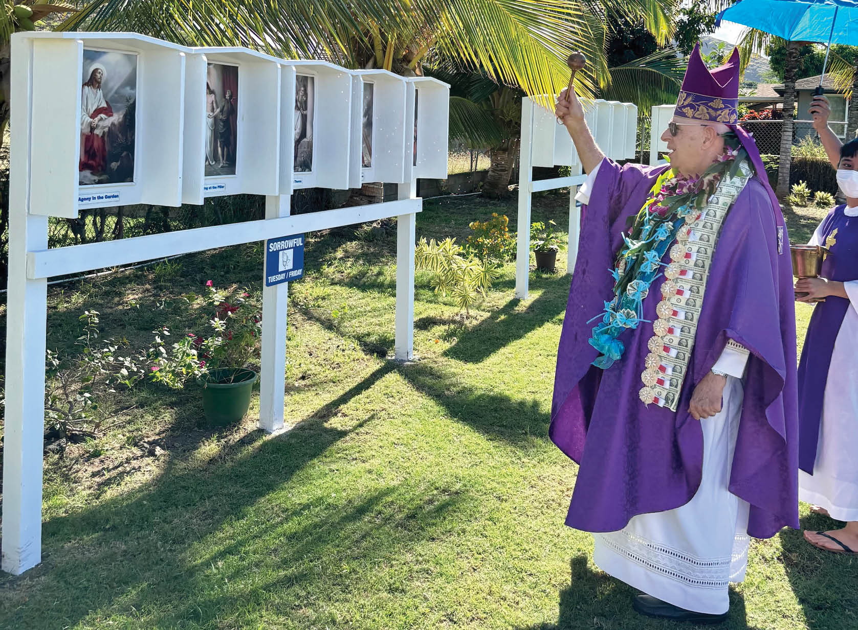 Bishop Larry Silva blesses the outdoor Sorrowful Mysteries of the rosary at Sacred Heart Church in Waianae. (Photos courtesy of Glenn Klinger)
