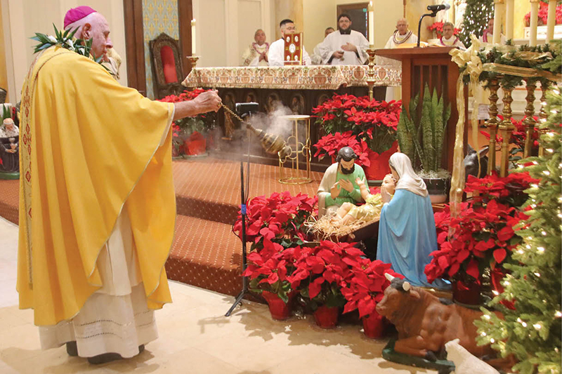 Bishop Larry Silva incenses the nativity scene in the Cathedral Basilica of Our Lady of Peace Jan. 6 during the deacon ordination Mass of Anthony Tran. (Photo courtesy of Dann Ebina)