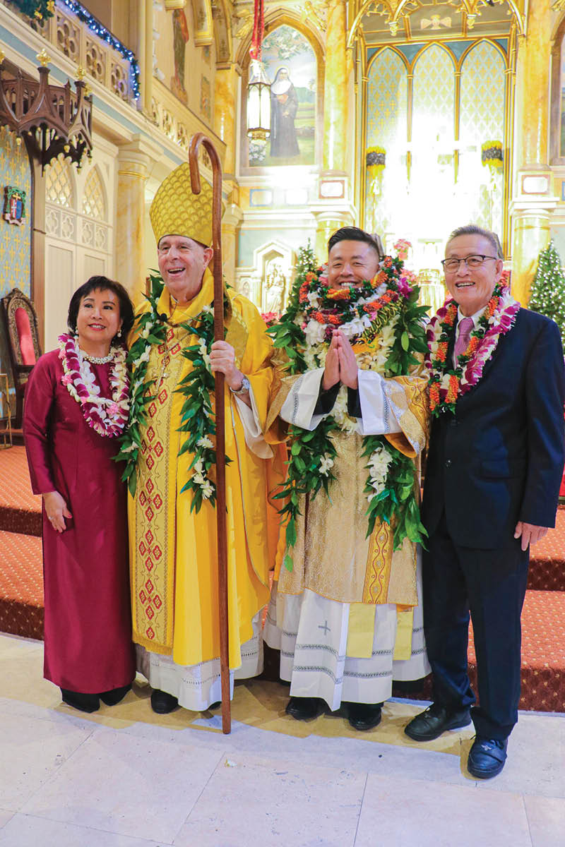 The Cathedral Basilica of Our Lady of Peace in Honolulu was filled with witnesses to Tran’s diaconate ordination by Bishop Larry Silva. Priests, deacons, seminarians, friends and family all the way from Southern California attended.
