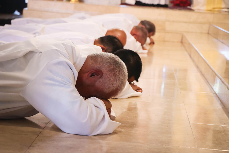 Six deacon candidates prostrate themselves at their ordination Mass Jan. 20 at the Co-Cathedral of St. Theresa. (HCH photo | Jennifer Rector)