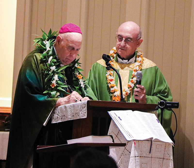 Bishop Larry Silva signs a document closing the diocesan phase of the canonization process of Joseph Dutton as Msgr. Robert Sarno, episcopal delegate for the cause for canonization, looks on. (HCH photo | Jennifer Rector)