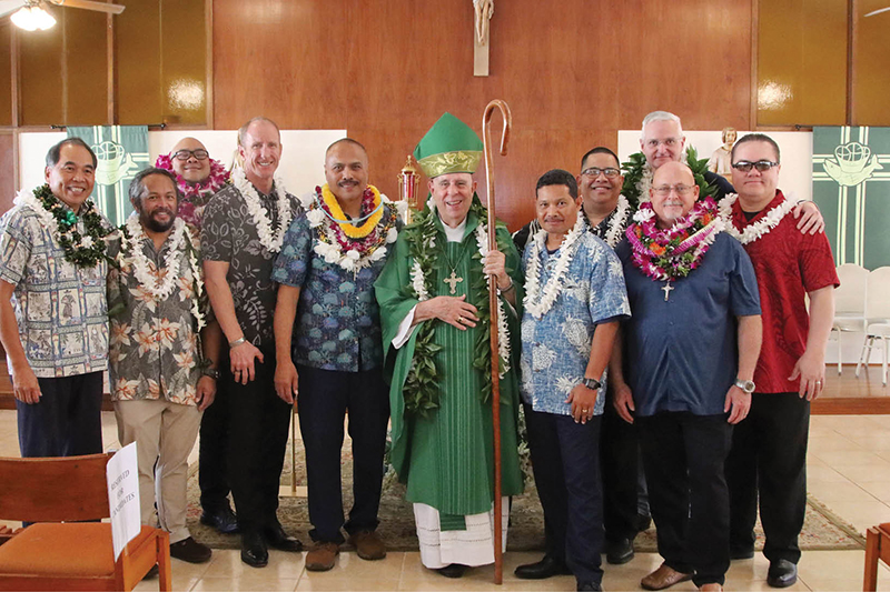 Permanent deacon candidates of the diocese’s cohort 11 pose for a group photo with Bishop Lary Silva following their Rite of Candidacy Jan. 14 at St. Stephen Diocesan Center. They are, from left, Peter Gumataotao, Emilio Macalalad, Clifford B. Villareal, Robert Seng Berg, Alvin A. Sniffen, Julian Taifmai, Stephen E.K.L. Lee, John W. Pollard, Jared M. Zick and Barry M. Danielson. The men took this step toward ordination after two years of aspirancy. (Photo courtesy of Dann Ebina)