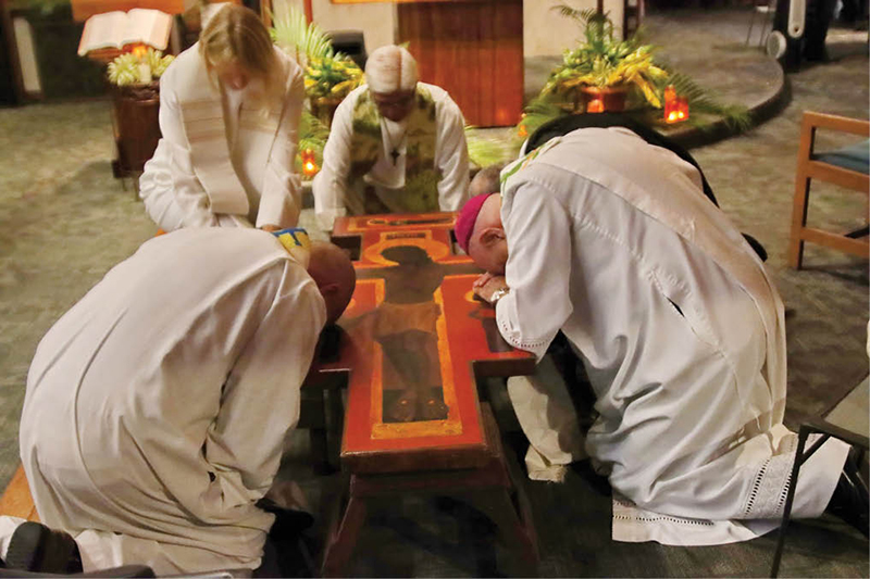Bishop Larry Silva, right, prays at an icon of the crucified Christ at the Taize prayer service for the Week of Prayer for Christian Unity Jan. 24 at the Newman Center at the University of Hawaii-Manoa. (Photo courtesy of Dann Ebina)