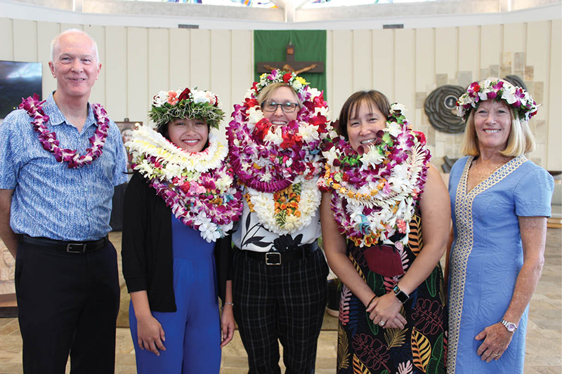 Before a full assembly in its Mystical Rose Oratory, Chaminade University of Honolulu awarded its annual Heritage Awards to three members of its community at a special Mass Jan. 24. From left, rector and vice president for mission Marianist Brother Edward Brink, who presided over the presentation; Chaminade Scholar and senior Victoria Delacruz, winner of the Founders’ Award; director of financial aid Amy Takiguchi, who received the Marianist Award; vice provost Janet Davidson, recipient of the Chaminade Award; and Chaminade president Lynn Babington. (Courtesy photo)