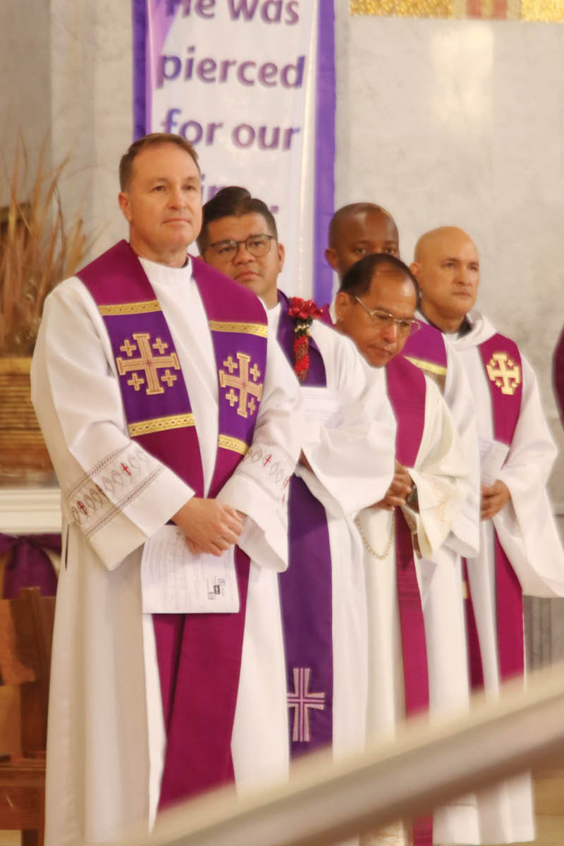 Fathers William Kunisch, left, EJ Resinto, Manny Hewe, Peter Miti and Khanh Hoang, vicars forane of Oahu’s five vicariates, attended the Rite of Election for catechumens on Oahu Feb. 18 at the Co-Cathedral of St. Theresa in Honolulu. Bishop Larry Silva gave the homily during the service.