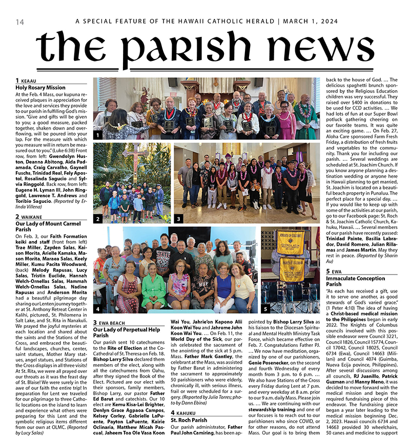 Hawaii Catholic Herald Parish News: March 1, 2024 02/28/2024 by Hawaii Catholic Herald Click here to view a pdf of the Hawaii Catholic Herald Parish News March 1, 2024.