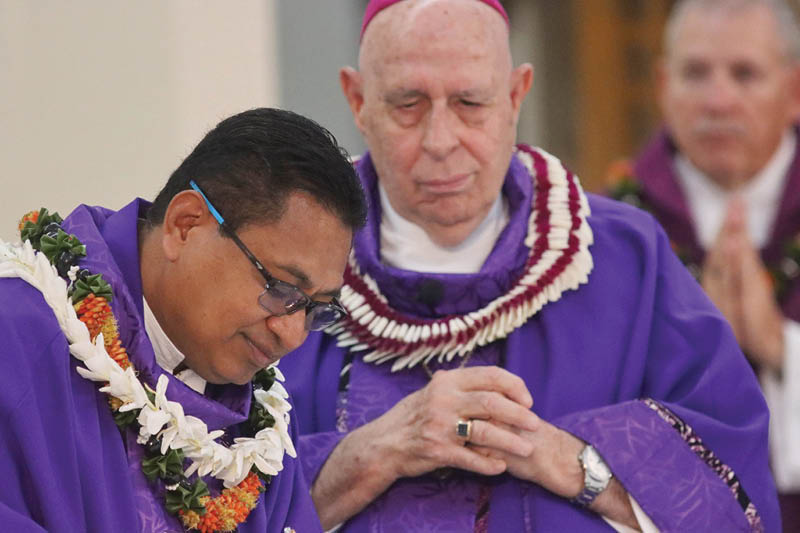 Sacred Hearts Father Lusius Nimu signed a document affirming his installation as pastor of St. Patrick Church in Kaimuki during his installation Mass March 3 as Bishop Larry Silva looked on. Among the clergy attending the celebration was Bishop Ryan Jimenez of the Diocese of Chalan Kanoa in Saipan, Commonwealth of the Northern Mariana Islands. (Photo courtesy of Dann Ebina)