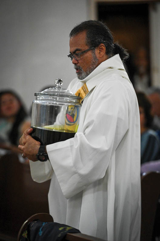 Deacon Christopher Ribucan carried a vessel of holy oil March 14 during the Maui and Lanai Vicariate chrism Mass at Holy Rosary Church in Paia. (Rose Dela Cruz / St. Raphael Church)