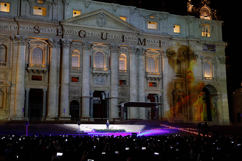 Italian tenor Andrea Bocelli sings before the premiere of a light show on the life of St. Peter the Apostle on the facade of St. Peter’s Basilica at the Vatican. (Paul Haring / CNS / 2022)