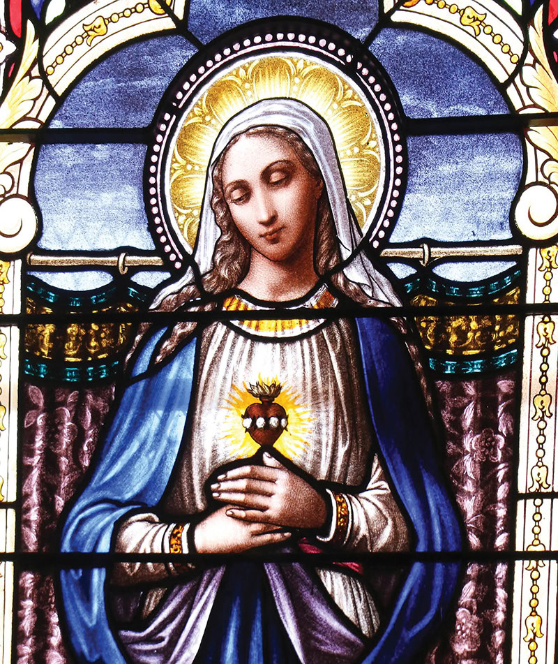 The Sacred Heart of Mary is seen in a stained-glass window at Sacred Heart Church in Honolulu. (Jennifer Rector / Hawaii Catholic Herald)