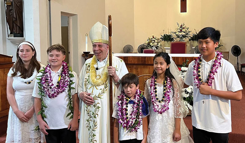 At the 5 p.m. Mass on April 13 at St. Joseph Church in Hilo, three children from Holy Rosary Church in Keaau — Chanelle Cabaccang, Joshua Foronda and Isaia-Edmunds Wong — and two from St. Theresa Church in Mountain View — Jackson David and Maykala Valencia — received their first holy Communion and confirmation from Bishop Larry Silva.